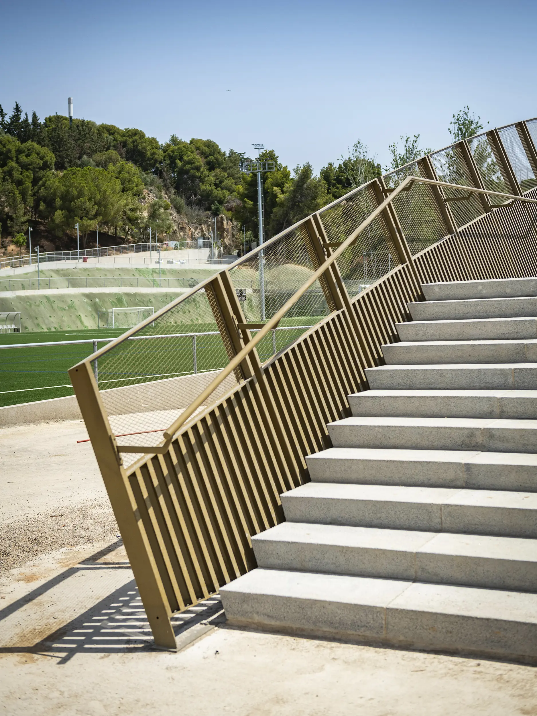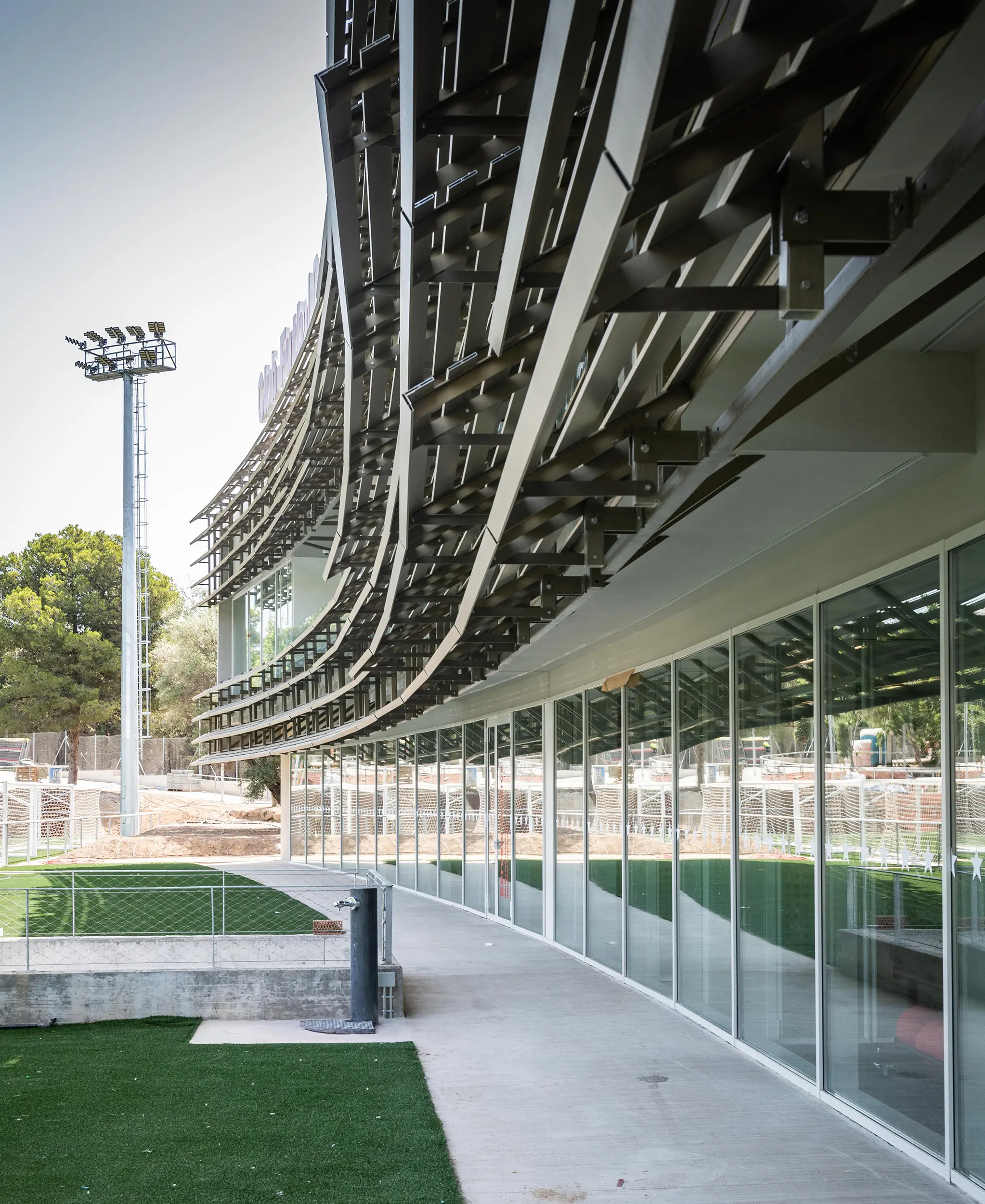 - Se dividió la obra en dos ámbitos, el de edificación y rehabilitación y el de urbanización y campos de fútbol. El equipo estuvo formado por arquitectos, ingenieros de instalaciones y estructuras, y un equipo de obra especializado en estructuras metálicas y acabados. La coordinación entre oficios fue clave para adaptarse a un entorno activo y con plazos ajustados.