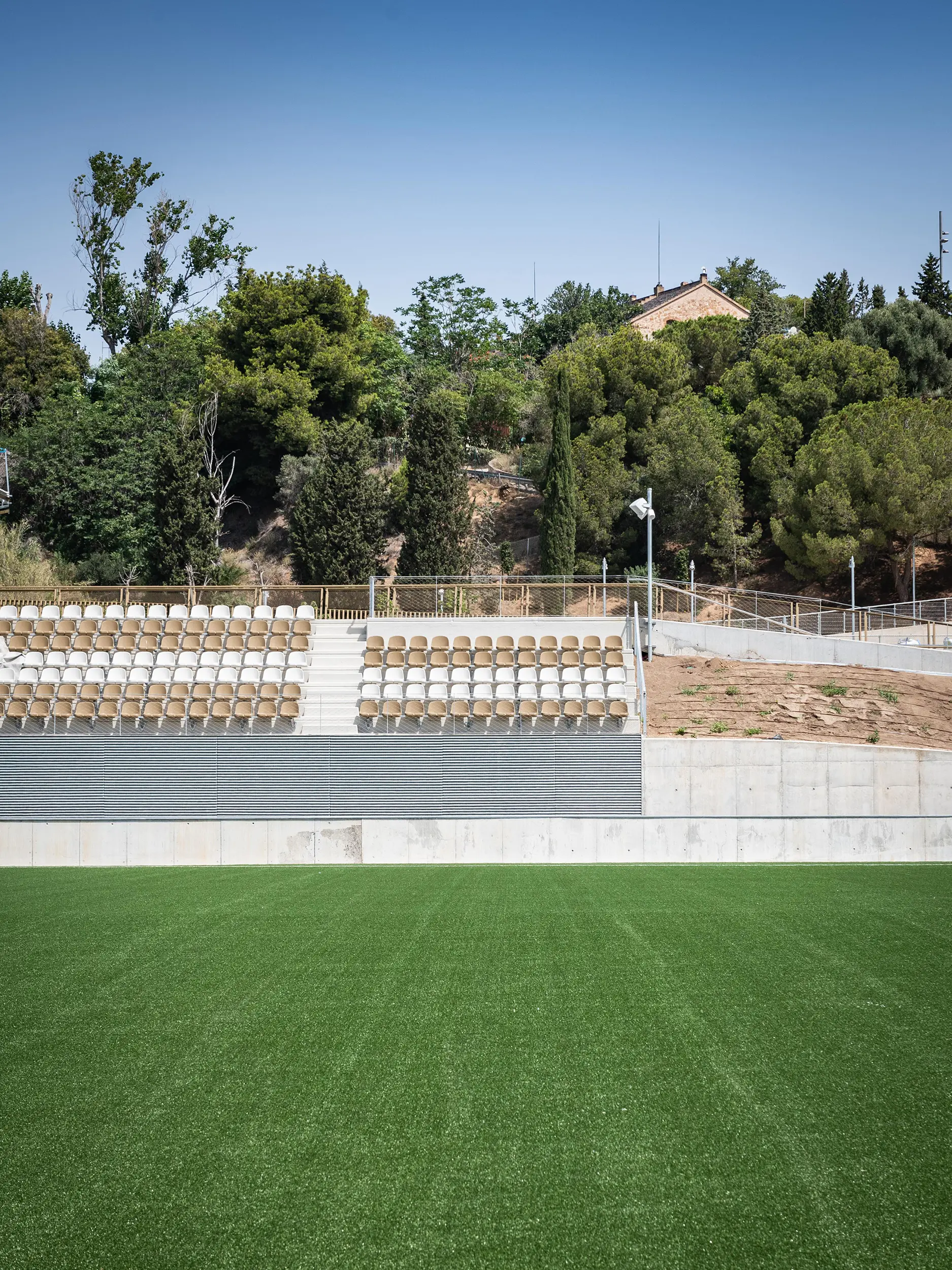 - Se instaló un sistema de recogida de aguas pluviales que reutiliza para el riego el agua de más del 75 % de la superficie del equipamiento, complementado con una planta de tratamiento de las aguas grises procedentes de las duchas de los vestuarios. Además, la instalación de 280 m² de placas fotovoltaicas genera 50 kW de energía limpia para autoconsumo.