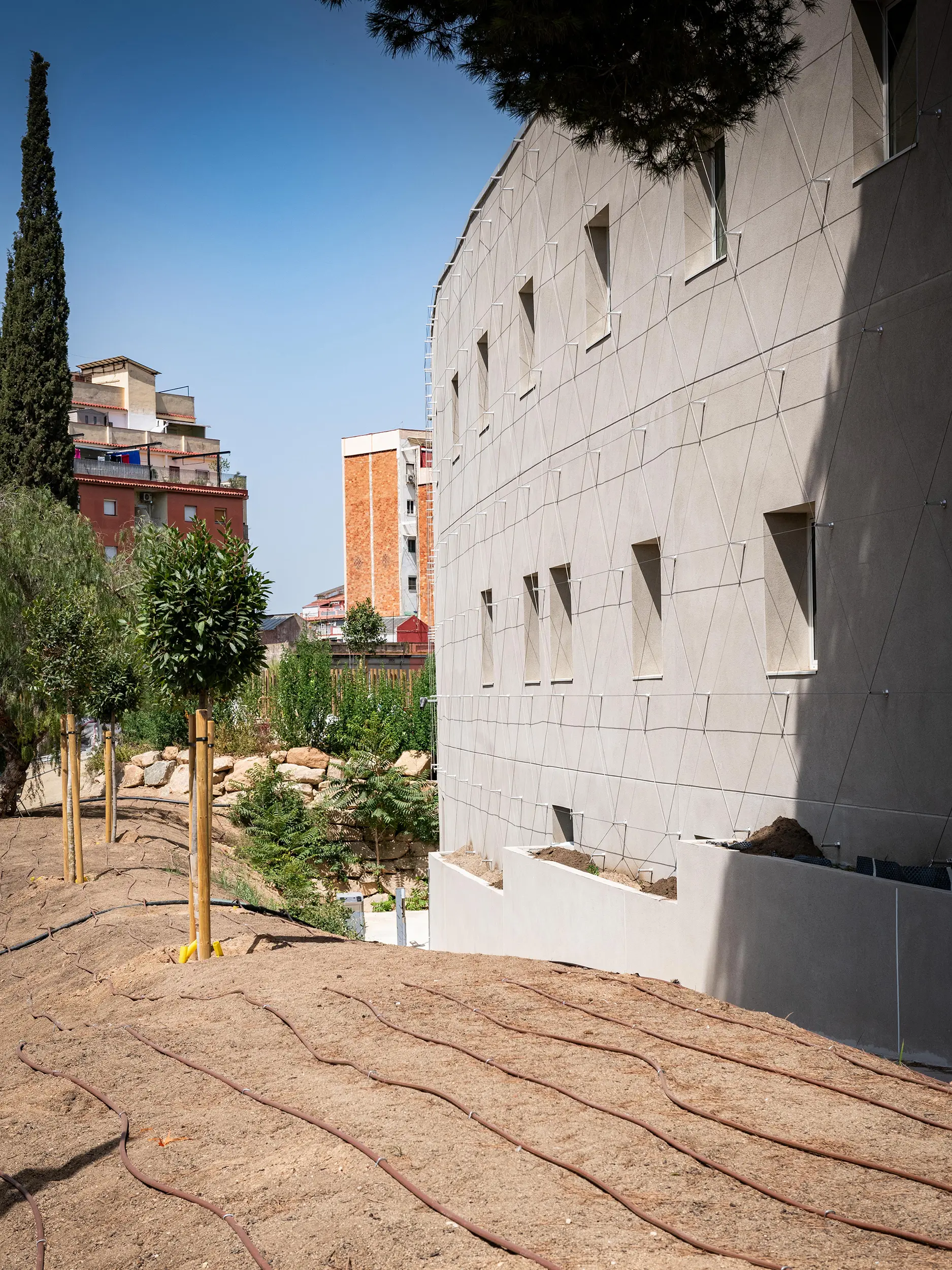 - Antes de comenzar la edificación, se llevó a cabo una actuación de mejora de las propiedades mecánicas del terreno. Se rebajó ligeramente el nivel y se incorporaron aditivos como cal y cemento, para minimizar los movimientos de tierra y reducir el impacto ambiental asociado al transporte a vertederos o a la importación de tierras nuevas.