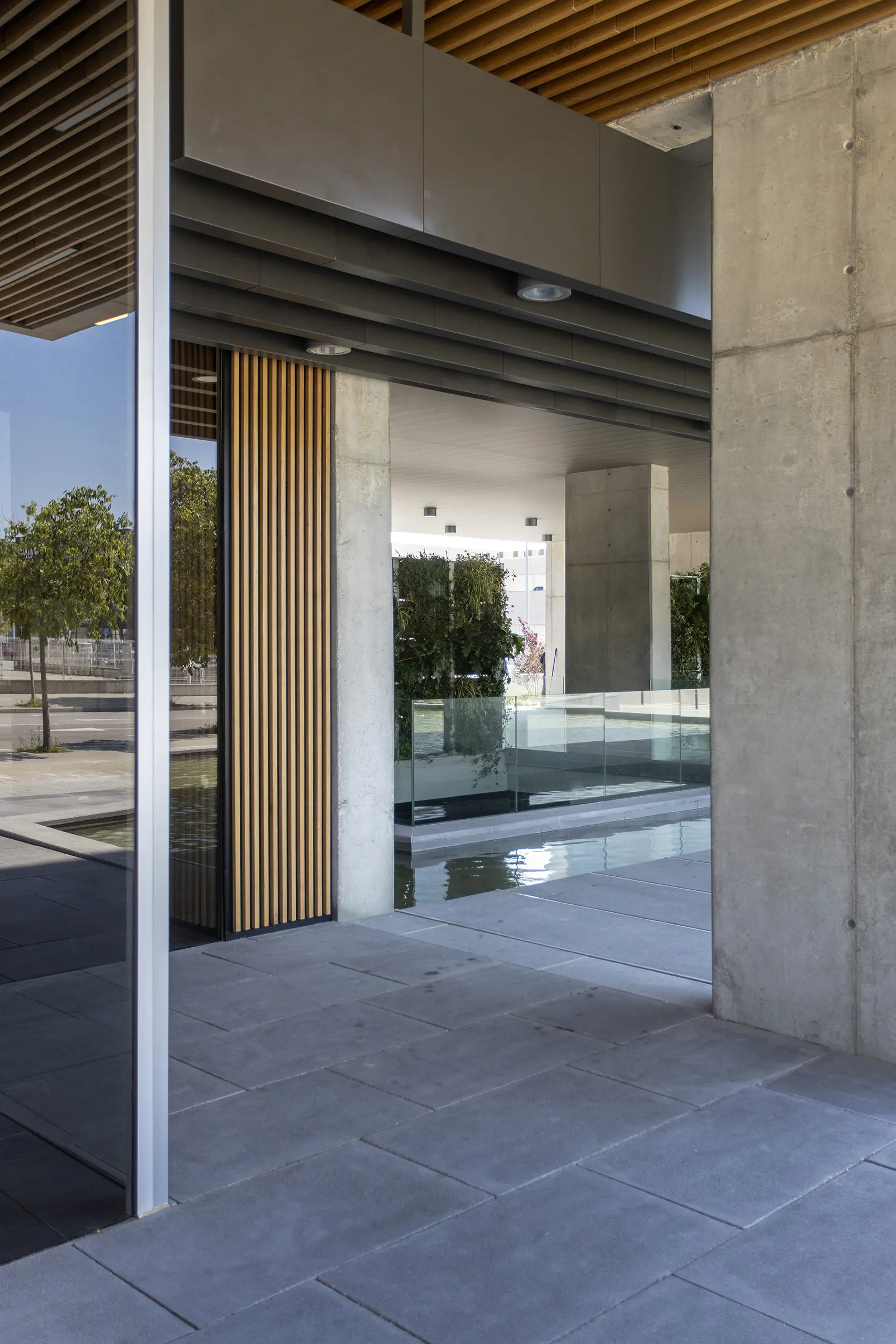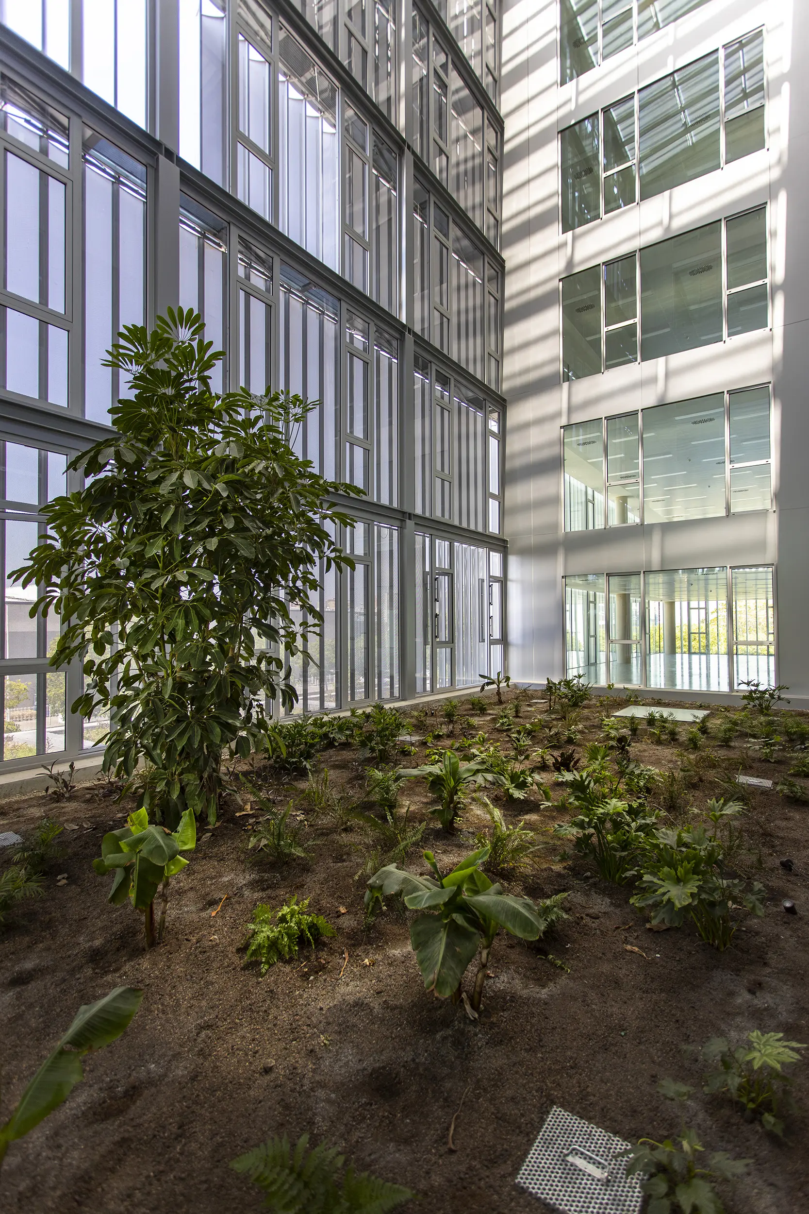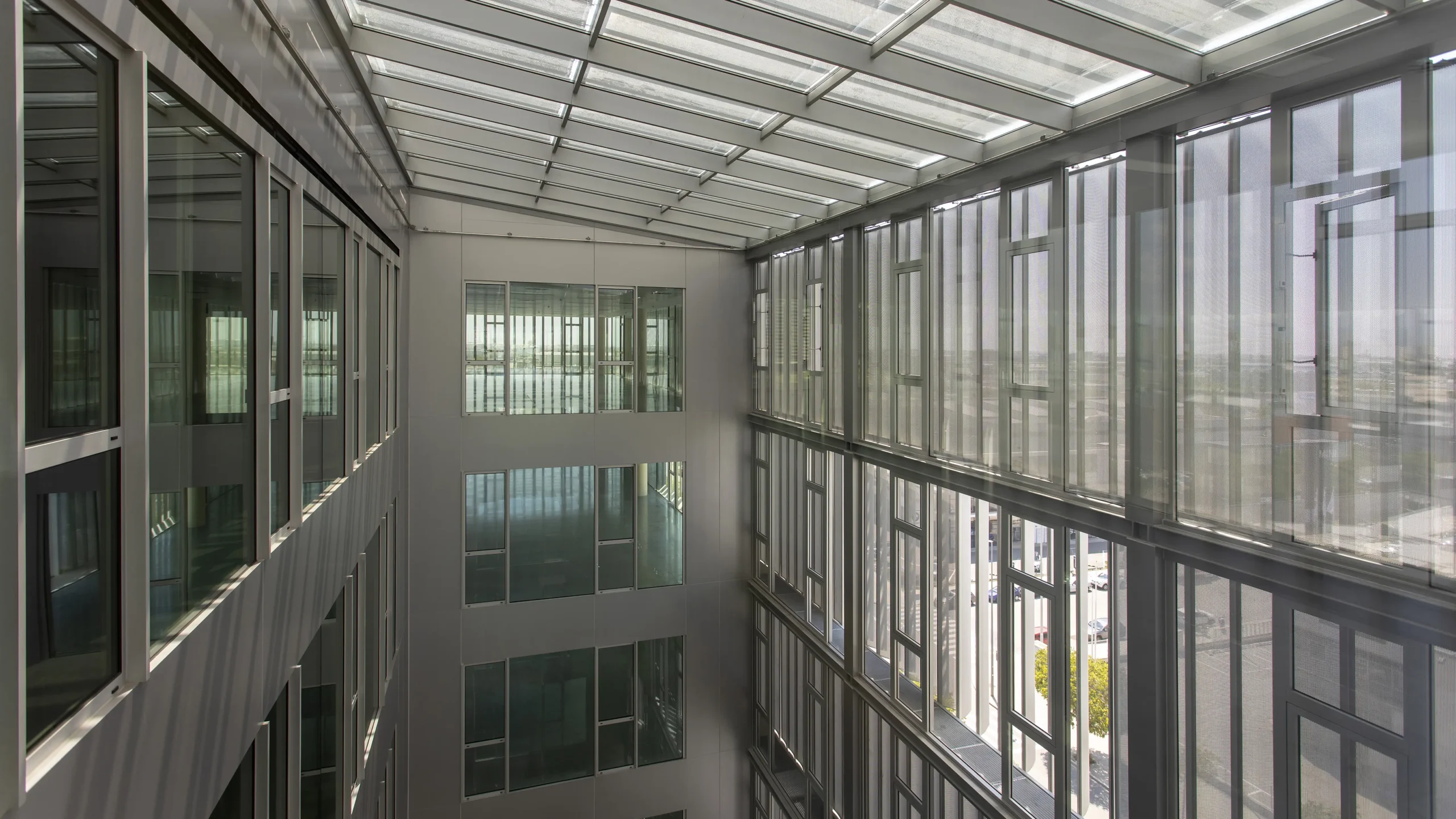 Construcción integral de un edificio corporativo flexible, eficiente energéticamente y de alta calidad arquitectónica. Destacan la fachada acabada con láminas móviles y el patio climático como estrategias pasivas de control solar y confort, así como las soluciones estructurales de hormigón, optimizadas para lograr espacios diáfanos con grandes luces.