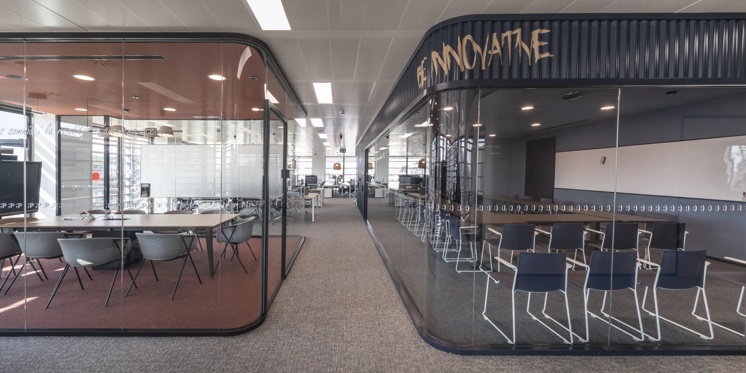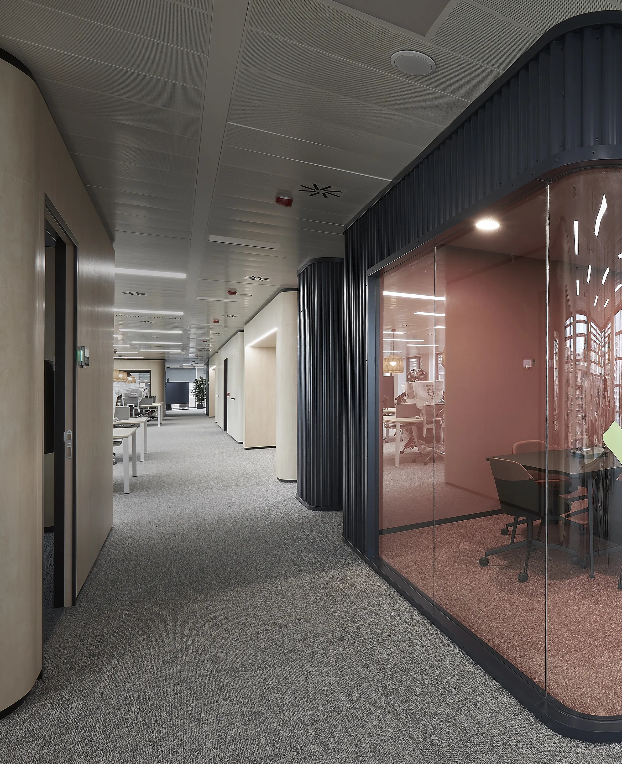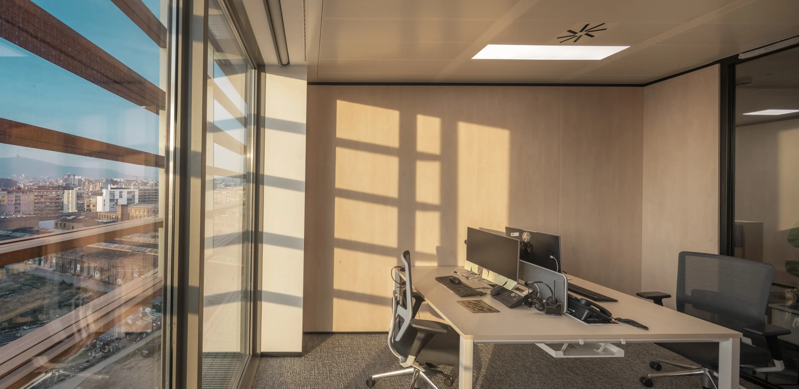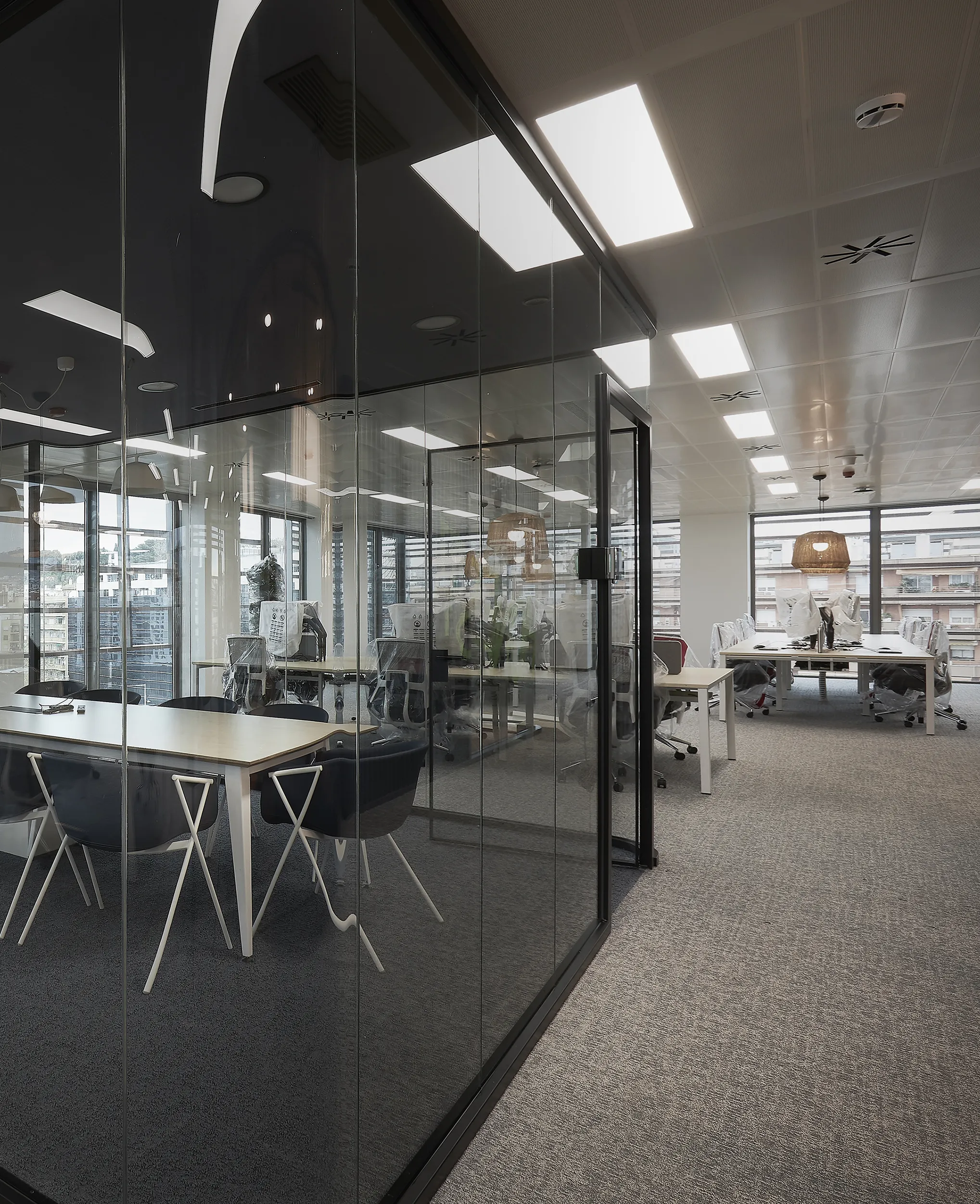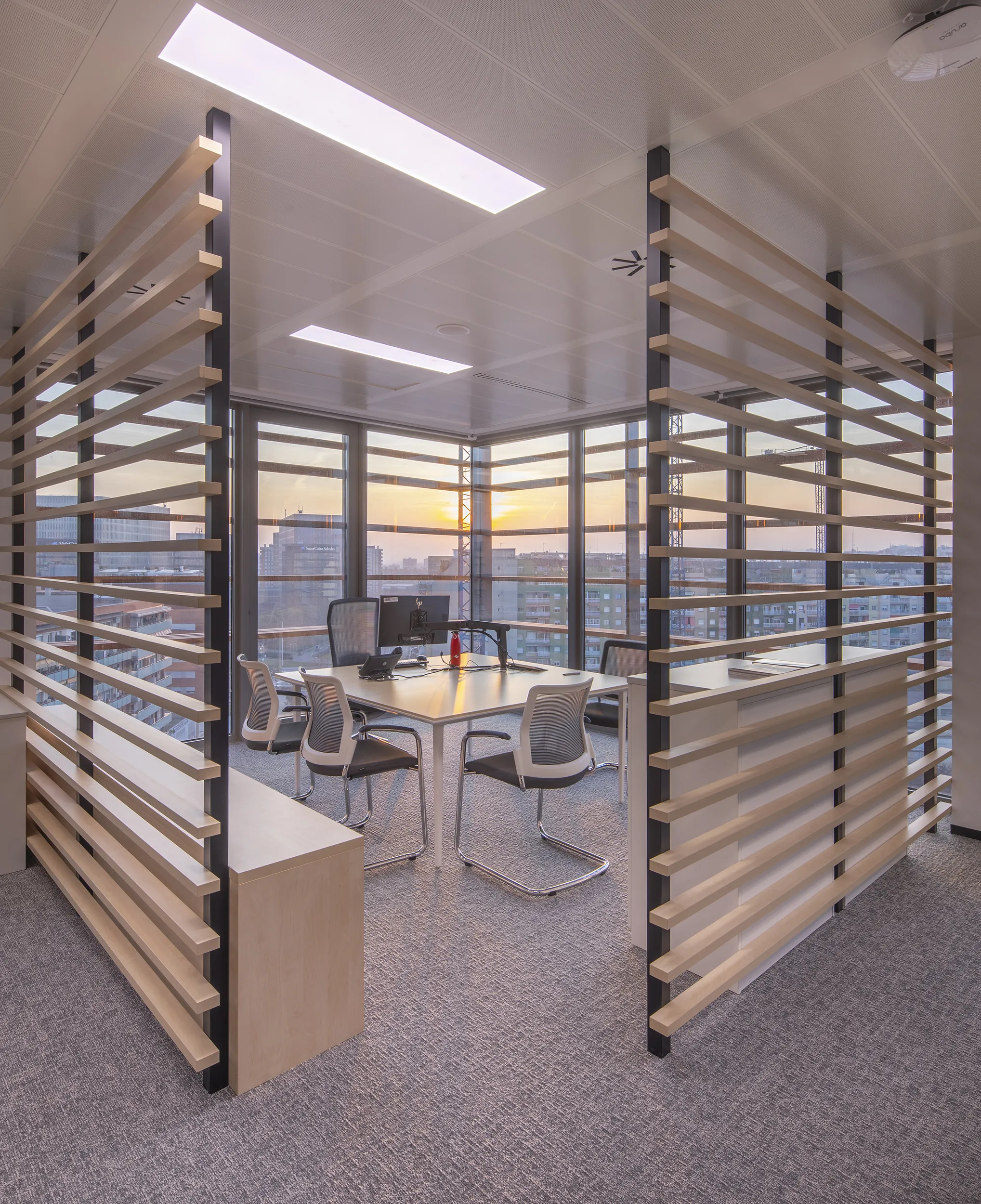 - La adaptación de las salas diáfanas de las once plantas del edificio permitió integrar espacios de trabajo, salas de reuniones, salas telefónicas, despachos, zonas operativas, recepciones y office. Todo ello con altos estándares funcionales, tecnológicos y organizativos.