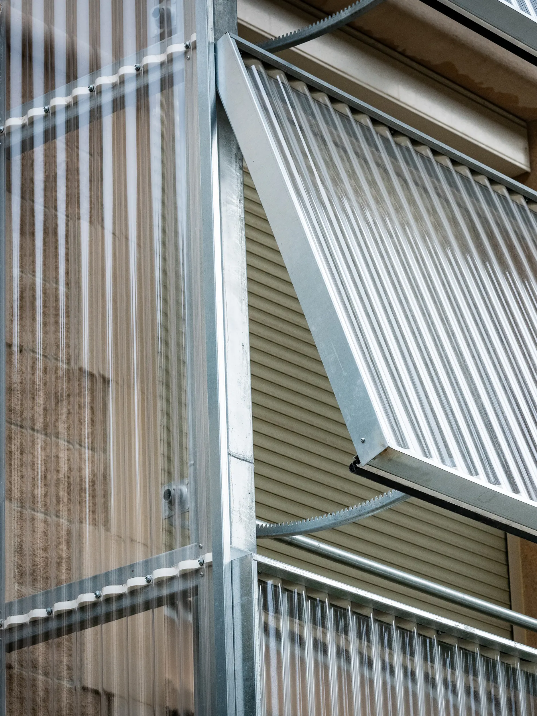 Incorporación en la fachada existente de una segunda piel de estructura metálica y policarbonato.