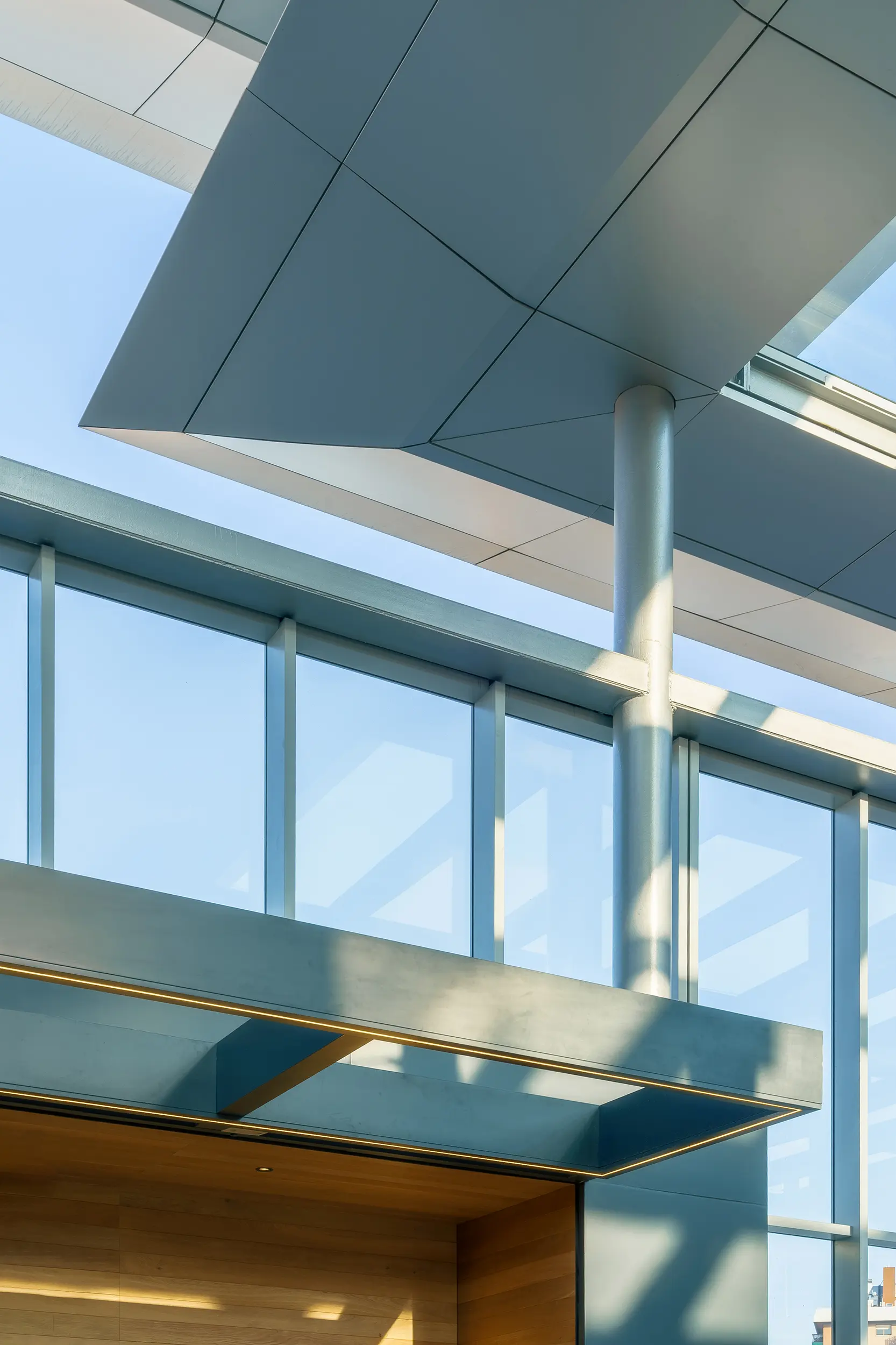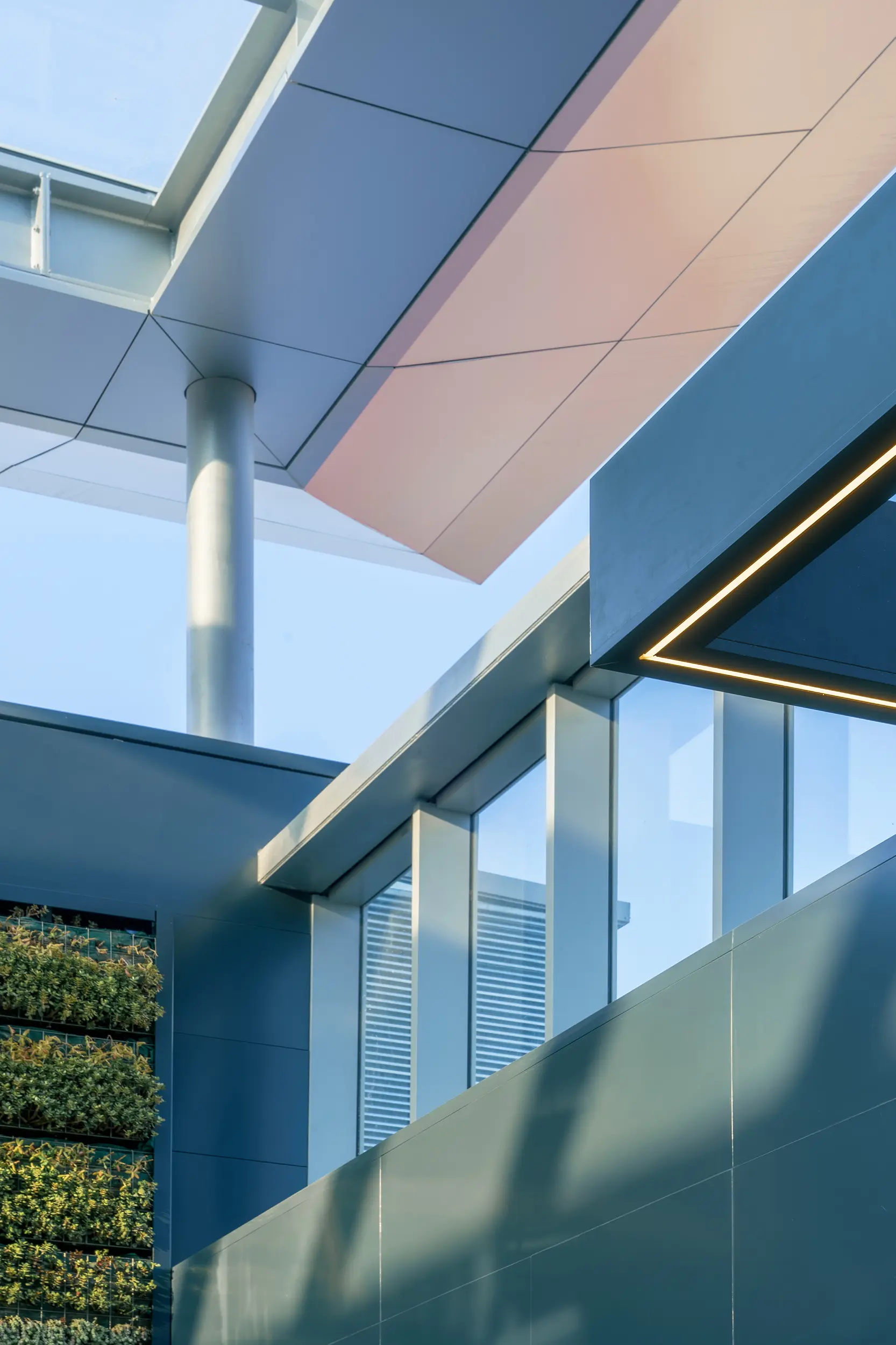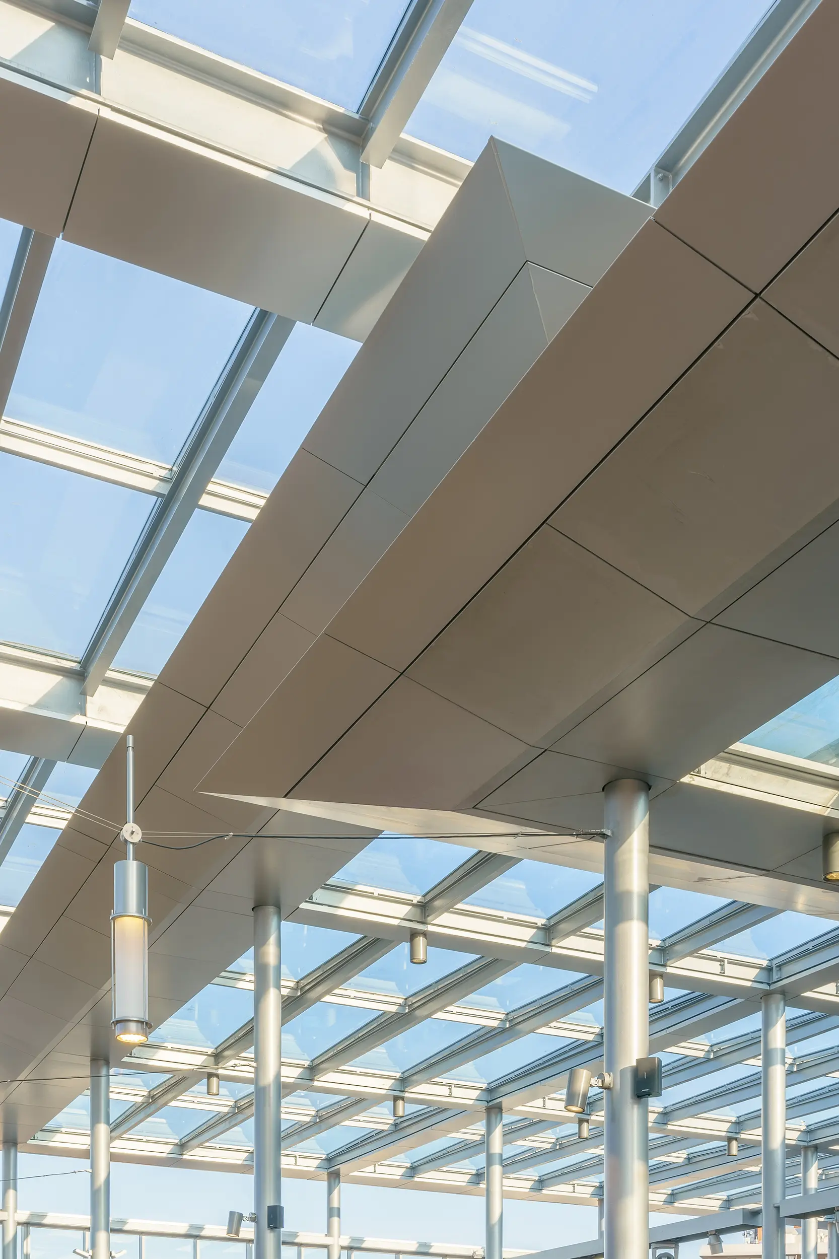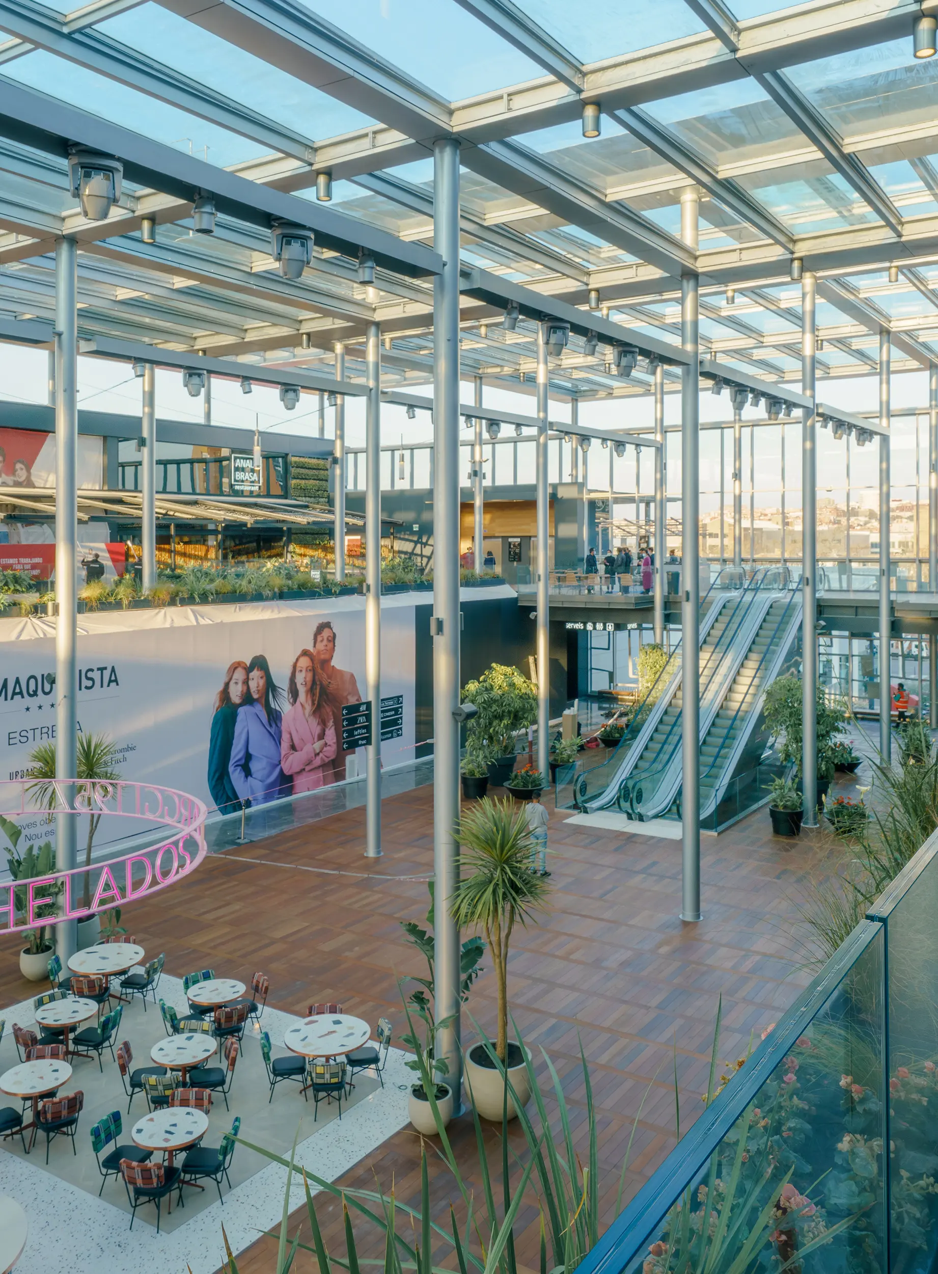 - Las cubiertas han sido sustituidas por un sistema de marquesinas estructurales de gran formato, que mantienen el carácter abierto del espacio, ofreciendo protección climática y luz natural.
